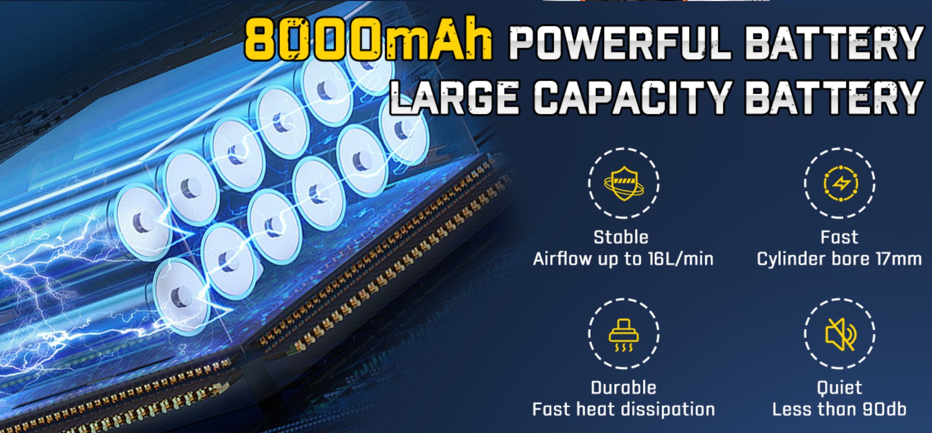 High-Quality Lithium Battery A full charge allows you to inflate up to 6 car tires from 0 to 120 PSI and 3 truck tires (195/55/R15) from 0 to 36 PSI. In addition, this electric bike pump has a powerful cooling system that enables continuous operation from full charge to full discharge without interruption. It ensures reasonable temperature, prevents overheating, and ensures efficient performance throughout the entire operation.