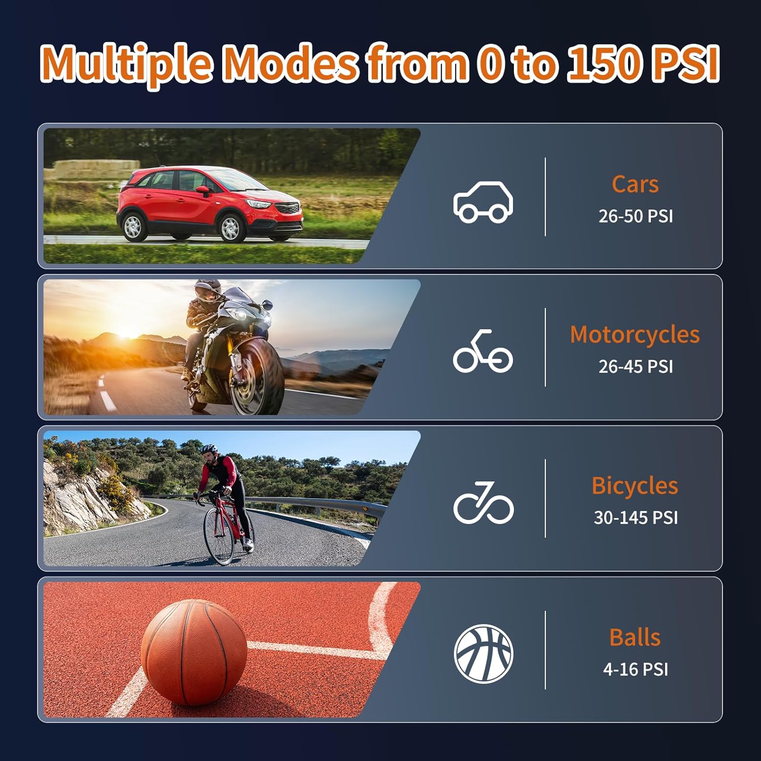 Automatic Electric Pump: The electric pump with LCD display can monitor real-time pressure. Adjust the desired pressure and the pump will automatically start inflating. It will automatically stop after reaching the preset value. This air pump also has a memory function that stores your last mode and pressure setting. It offers multiple modes from 0 to 150 PSI, suitable for a variety of vehicles and motorcycles.