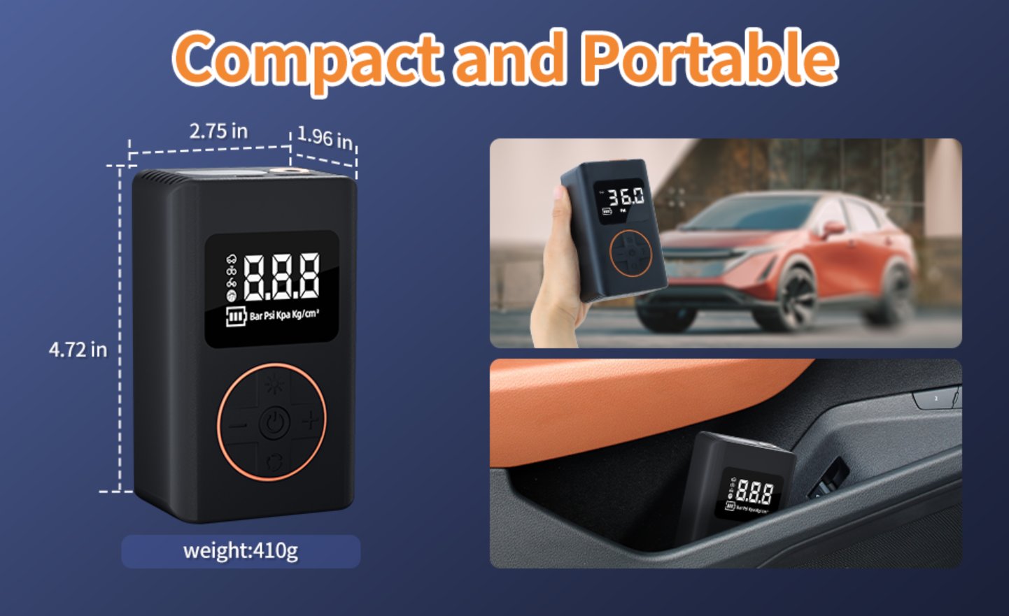 User-Friendly The tire inflator has 4 preset inflation modes (Bike, Motorcycle, Car and Ball) and 4 pressure measurement units (PSI, KPA, BAR, KG/CM²), which is especially suitable for beginners. It allows you to adjust the pressure value between 0-150 PSI according to the object to be inflated, and the preset modes meet different inflation needs.