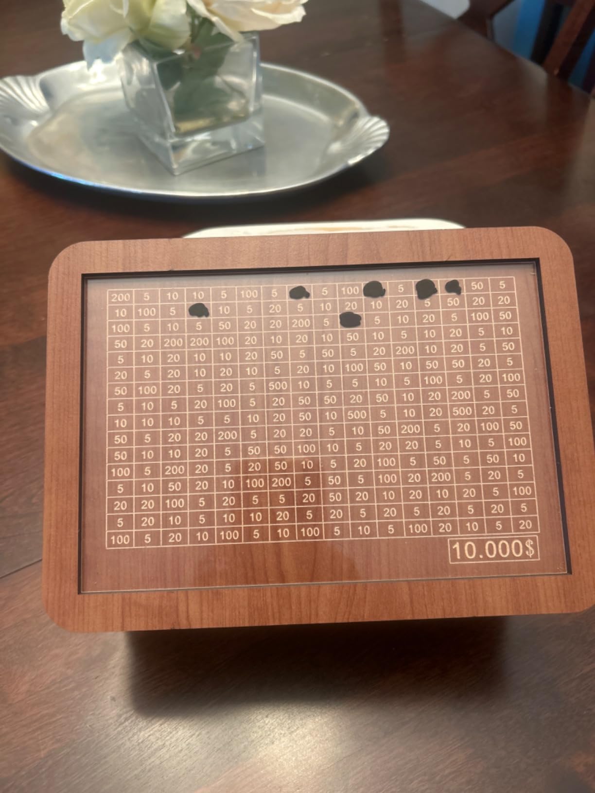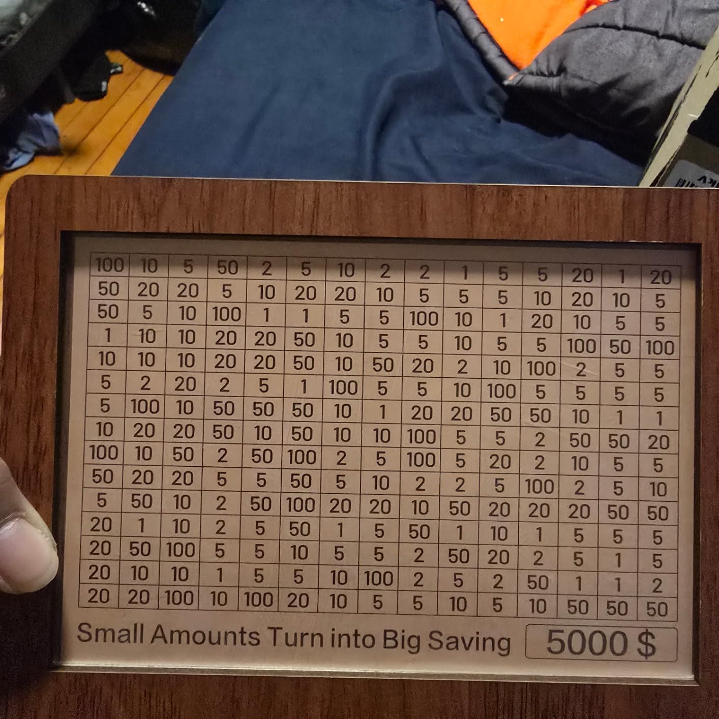 “The construction is solid. There’s a plastic cover over the numbers grid so you can erase the dots and reuse this box again. There are no holes on the box for the marker which is a bummer but definitely not a deal breaker. My friends and I have a goal to save &10k in one year versus giving our money away to millionaires for stupid things that we don’t need like over priced handbags!”