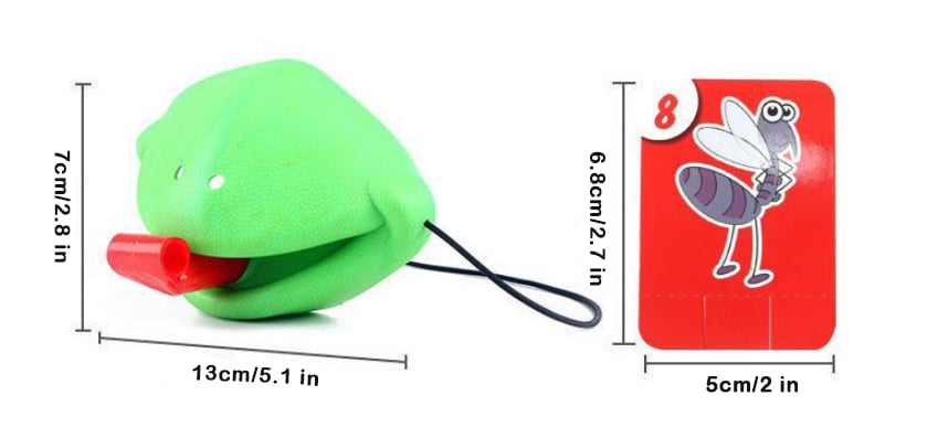 Both players in this superbly fun game wear chameleon mouth masks complete with extending red tongues. Similar to a party blower, puffing into the plastic tongue unfurls it for a quick strike.