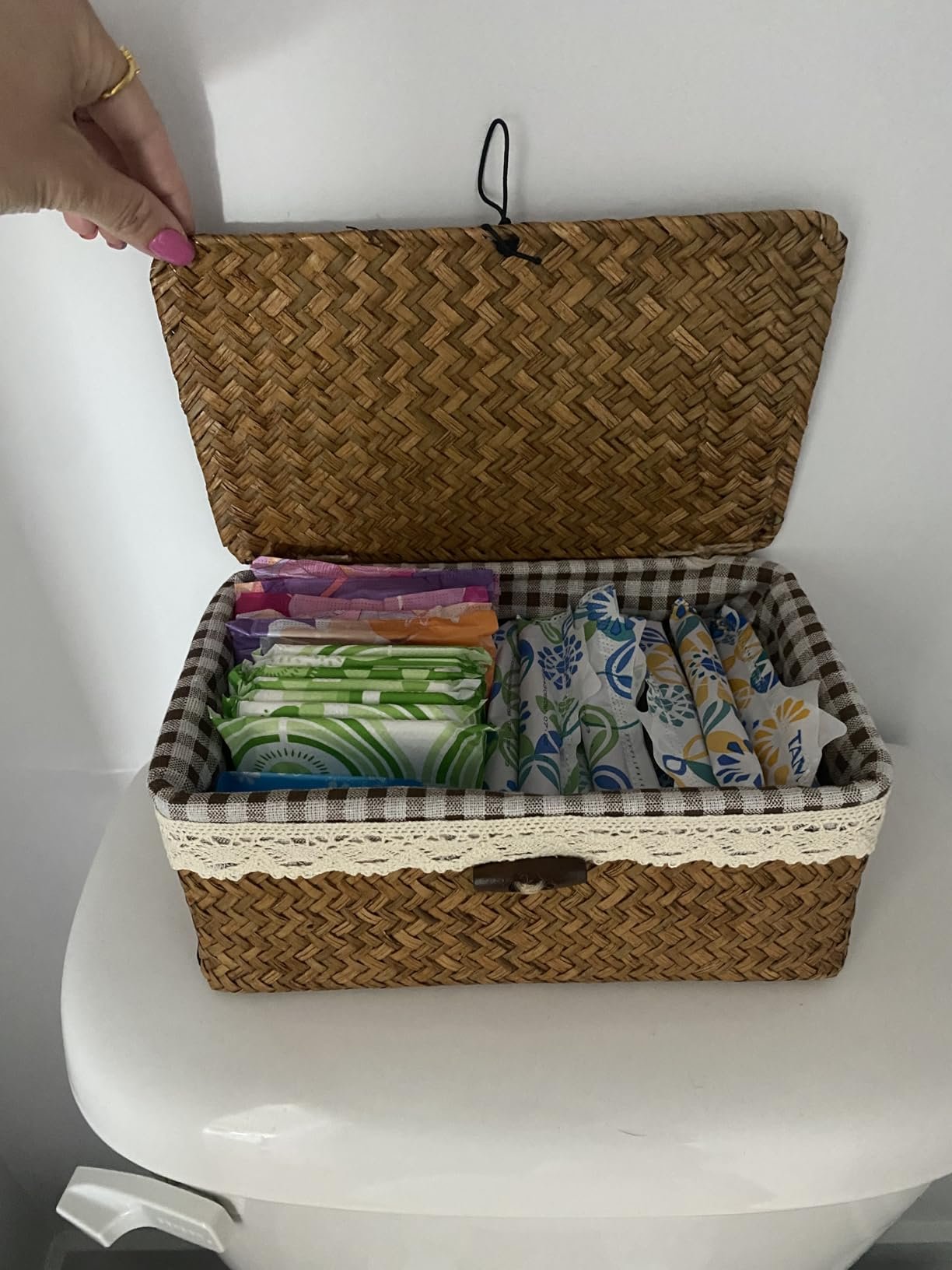 It includes a soft cotton liner adorned with a charming checkered pattern and delicate lace trim. This not only adds a touch of warmth but also protects the contents and enhances the overall aesthetic of the basket.