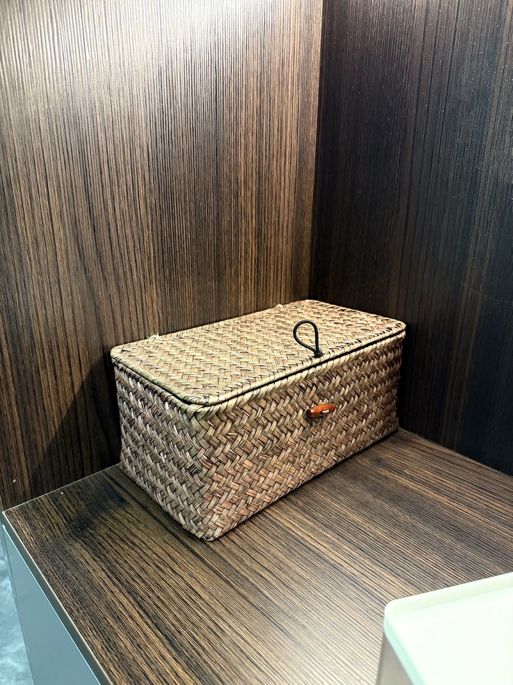 The matching woven lid covers the contents of the basket, reducing visual clutter and effectively protecting against dust.