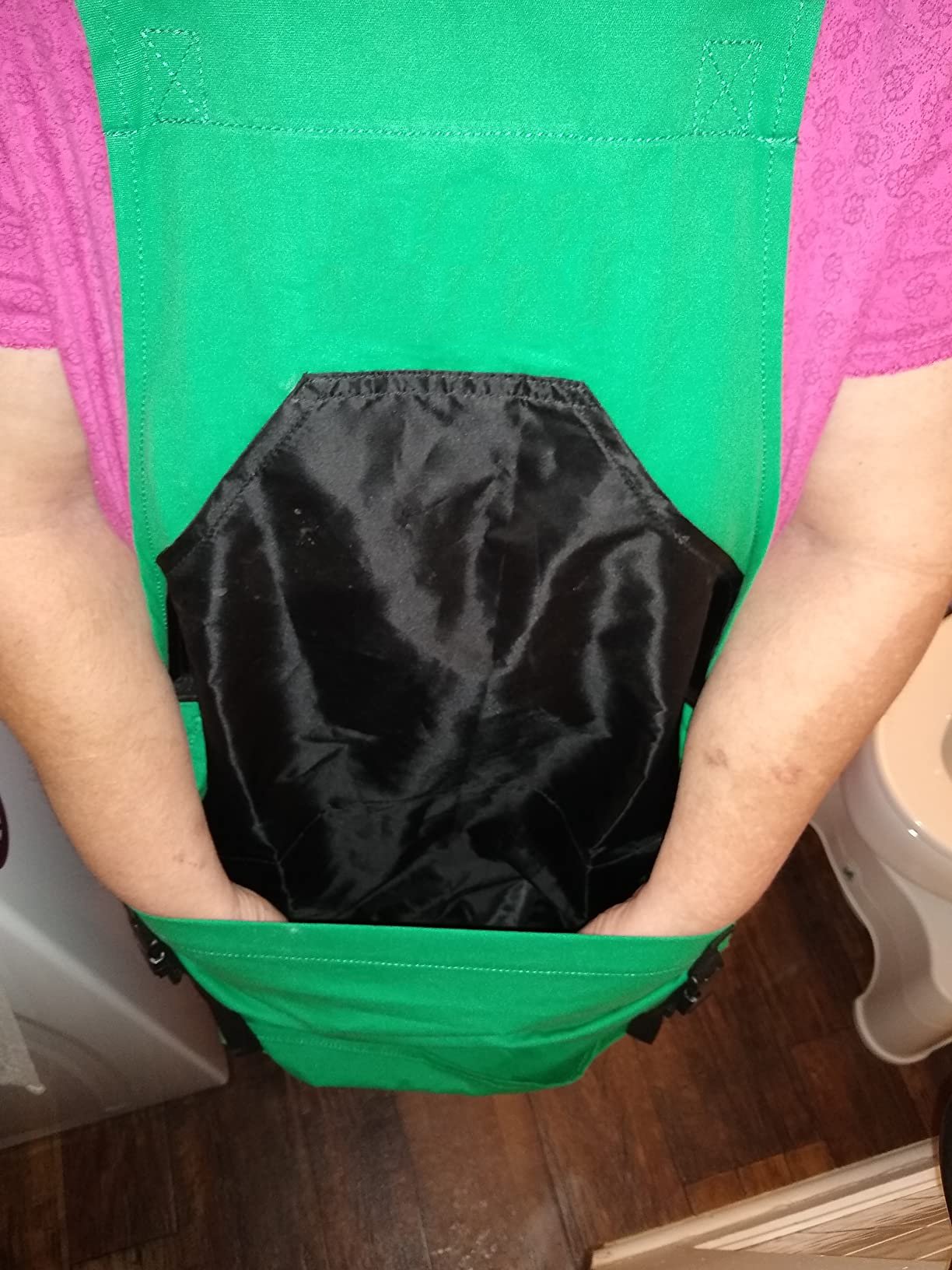 A: The kangaroo-style bottom pocket opens with buckles, allowing you to quickly empty your harvest or garden waste.
