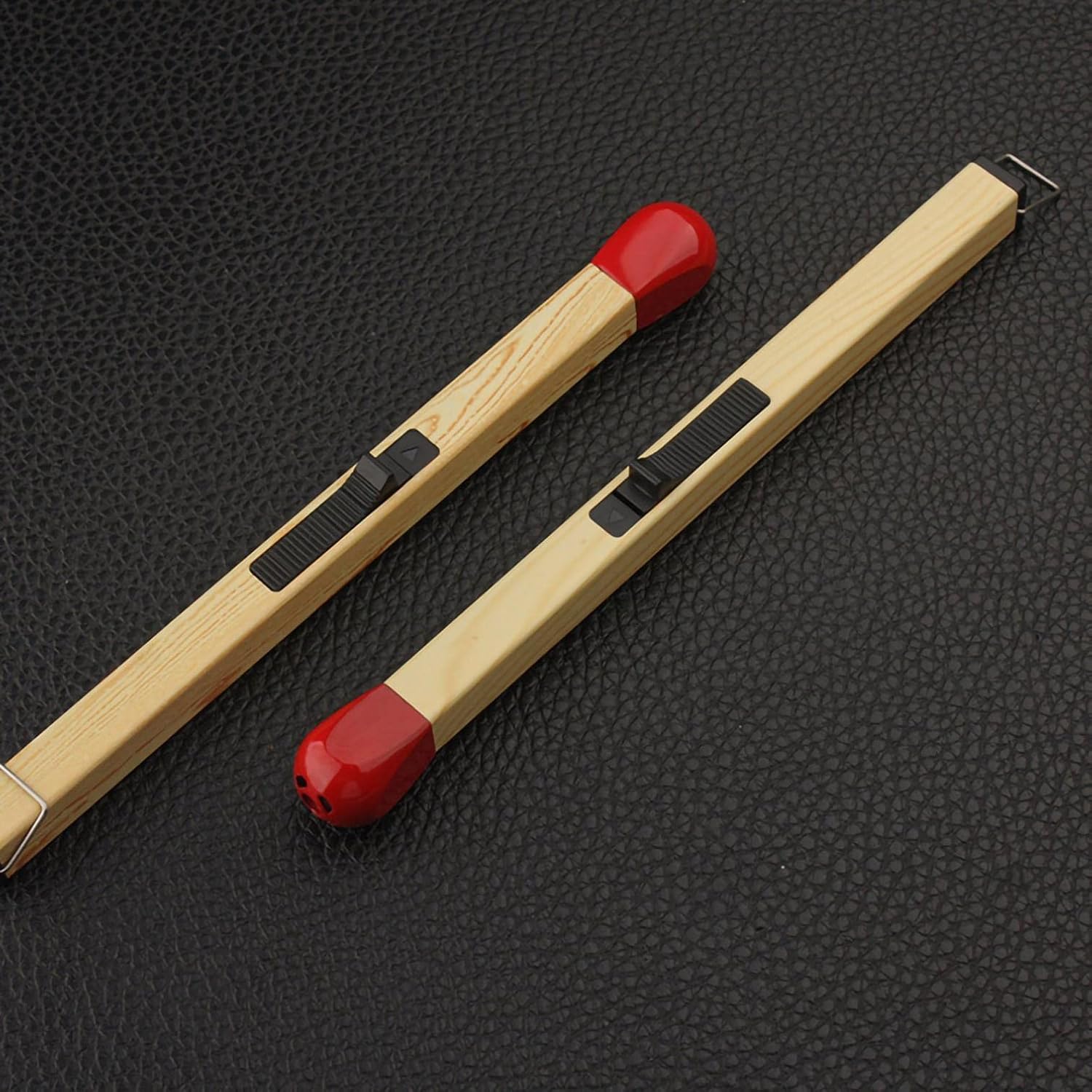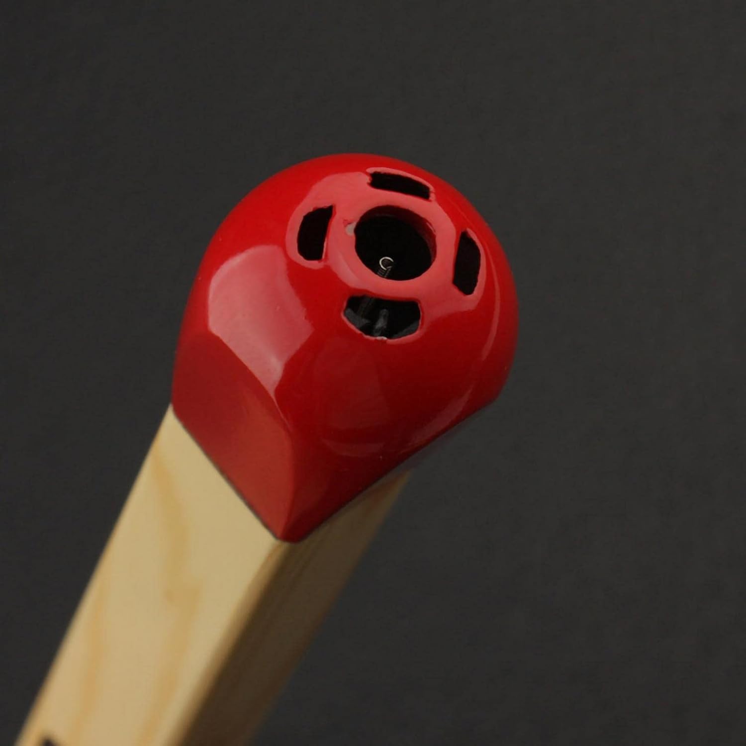 Measures 7 inches long x 0.5 inches wide, with wood colored stick, red tip, and black switch