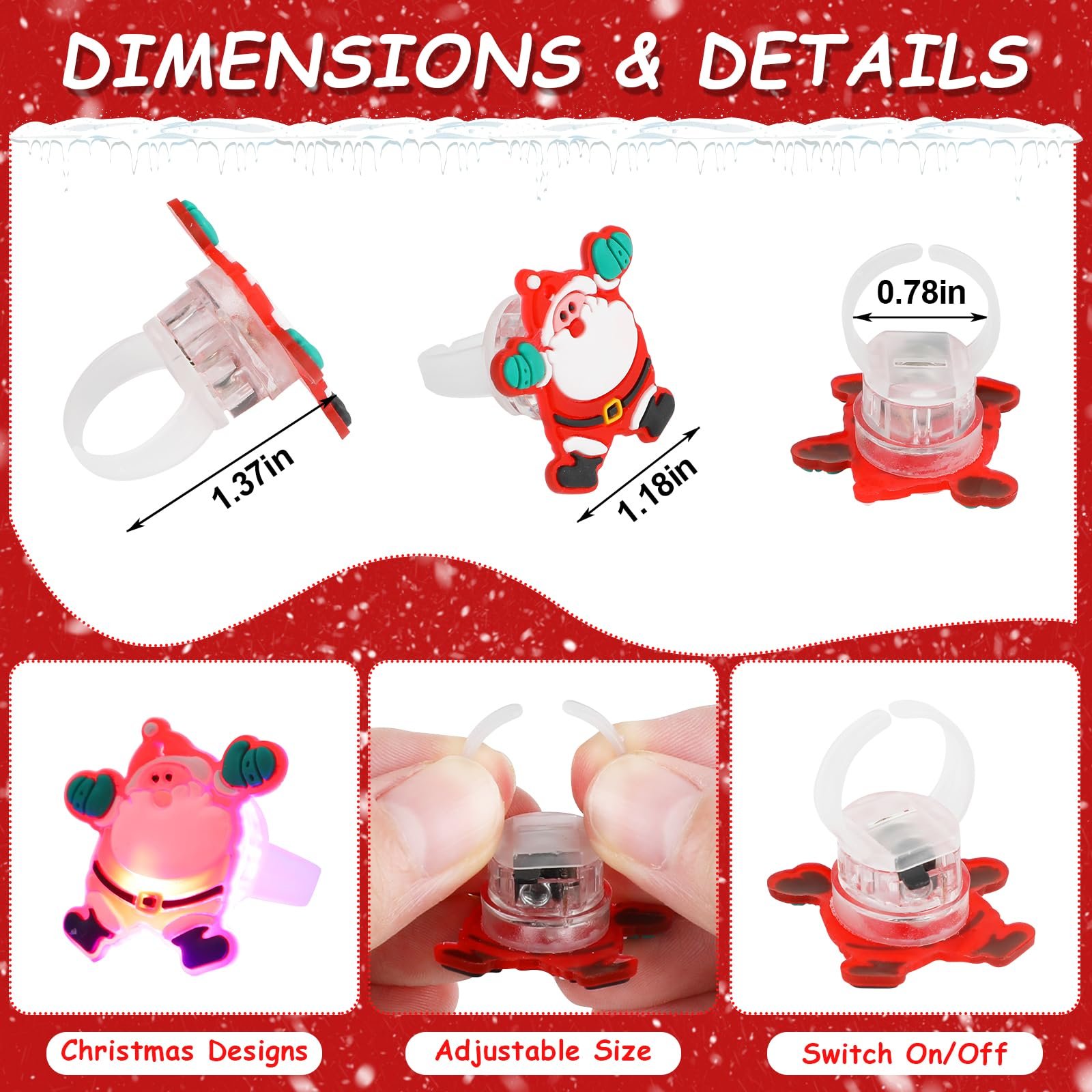 - Create a Christmas Atmosphere - Awesome glitter rings are great Christmas party gifts for family or friends gatherings. LED light-up rings add to the festive atmosphere. Great for clothing decorations and non-candy gifts. You can wear them on your fingers, hair, as table lamps or wall lamps, cake decorations and anything you want to light up.