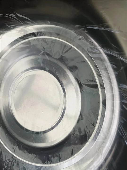 A deep stainless steel bowl to collect food or water