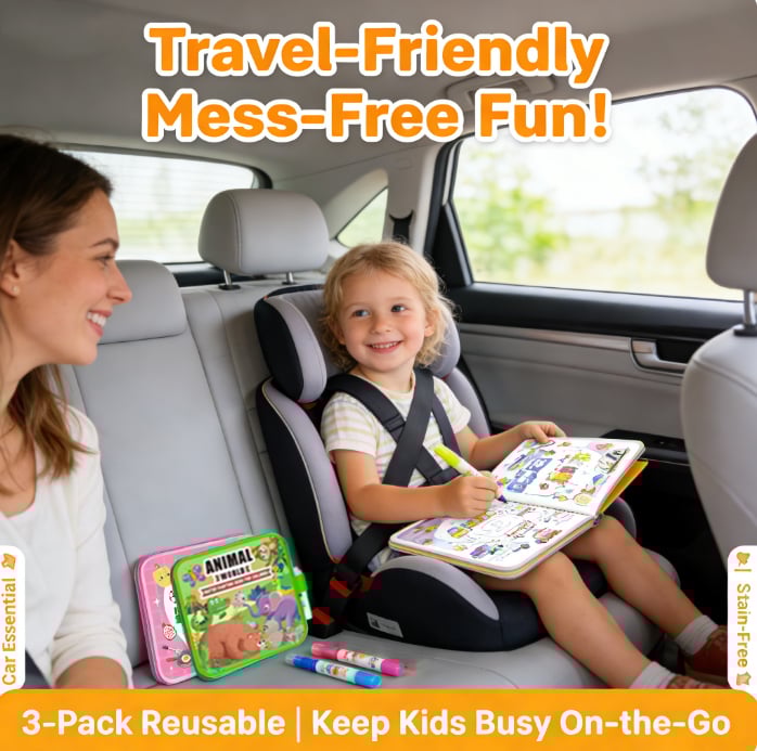 ✅ Safe & Mess-Free – Designed with little hands in mind, the chunky water pens are easy to grip and fill with water. The reusable pages reveal vibrant colors with just water, ensuring no stains on clothes, furniture, or walls. It’s the perfect travel companion!