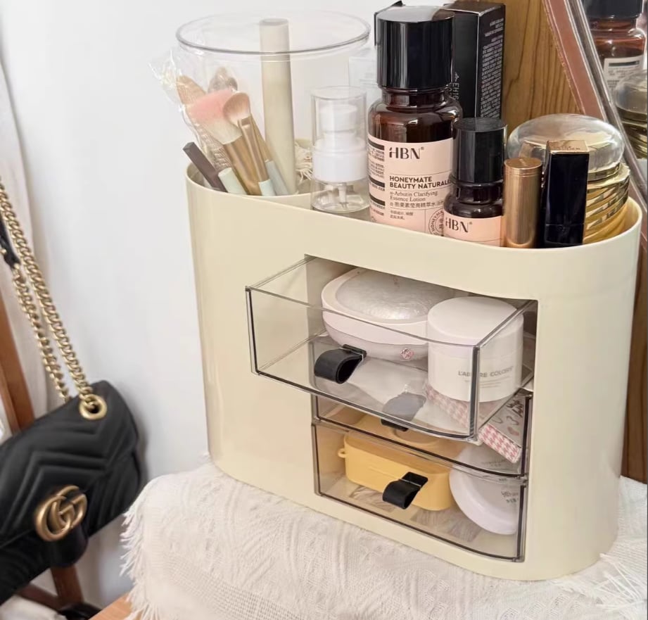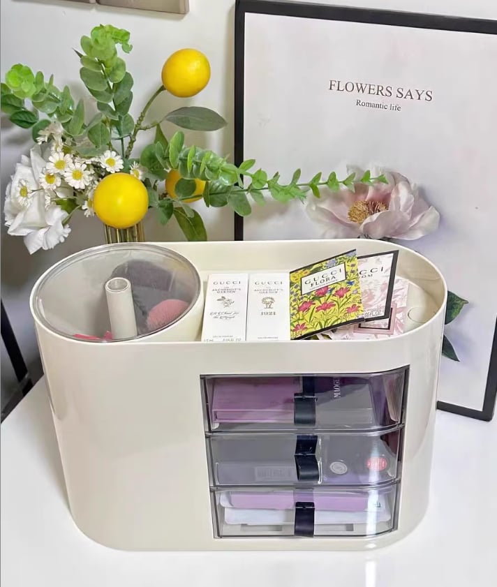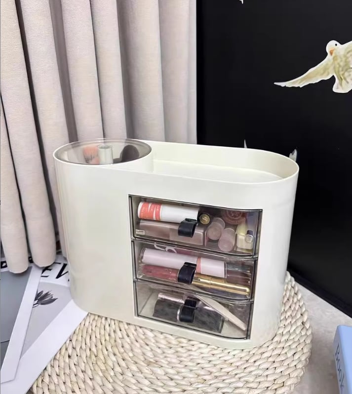 This sleek and functional makeup organizer is designed to keep your beauty essentials neatly arranged. With a pop-up brush holder, spacious drawers, and a dust-proof cover, itβs the perfect storage solution for your cosmetics and skincare. π§΄π